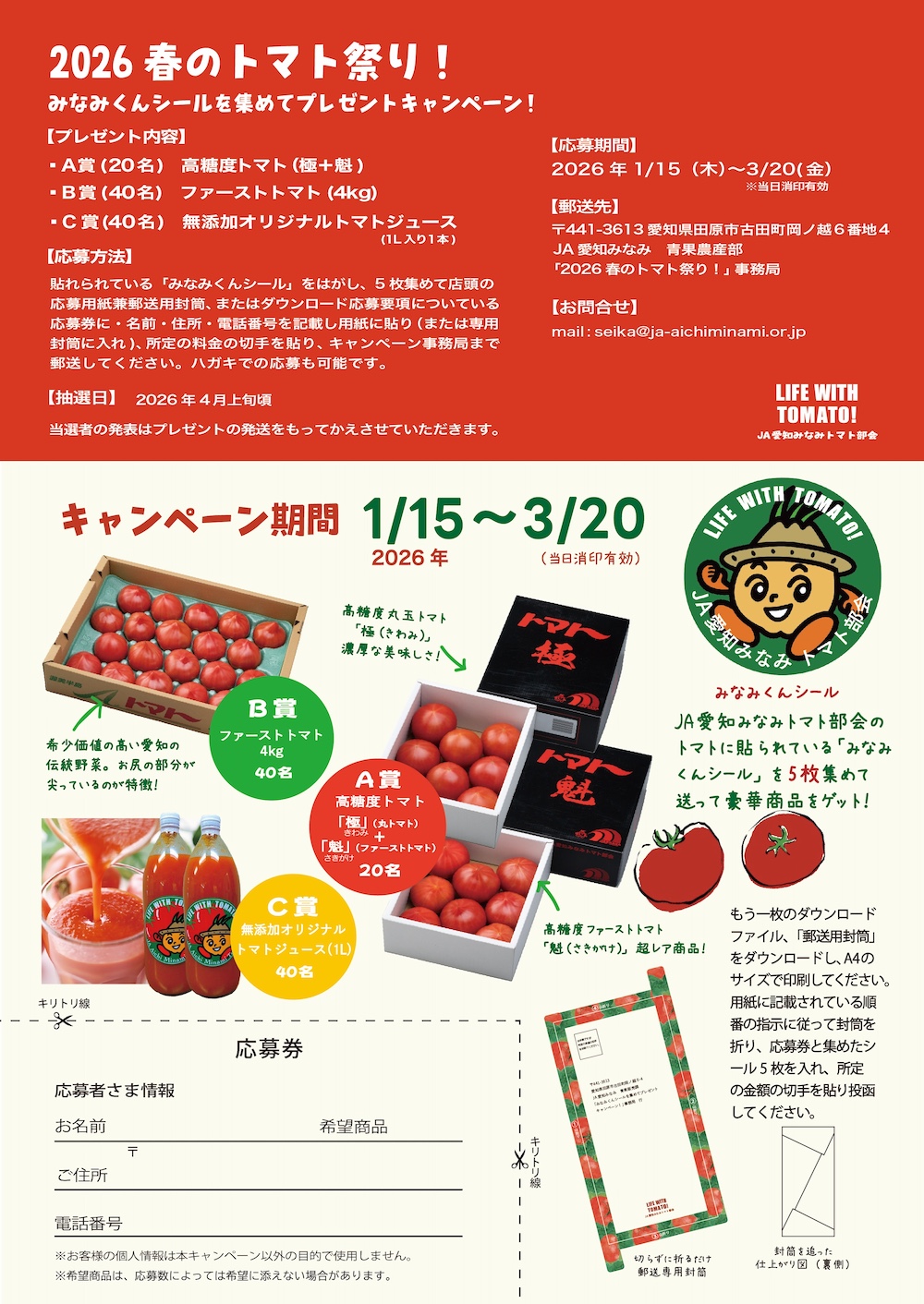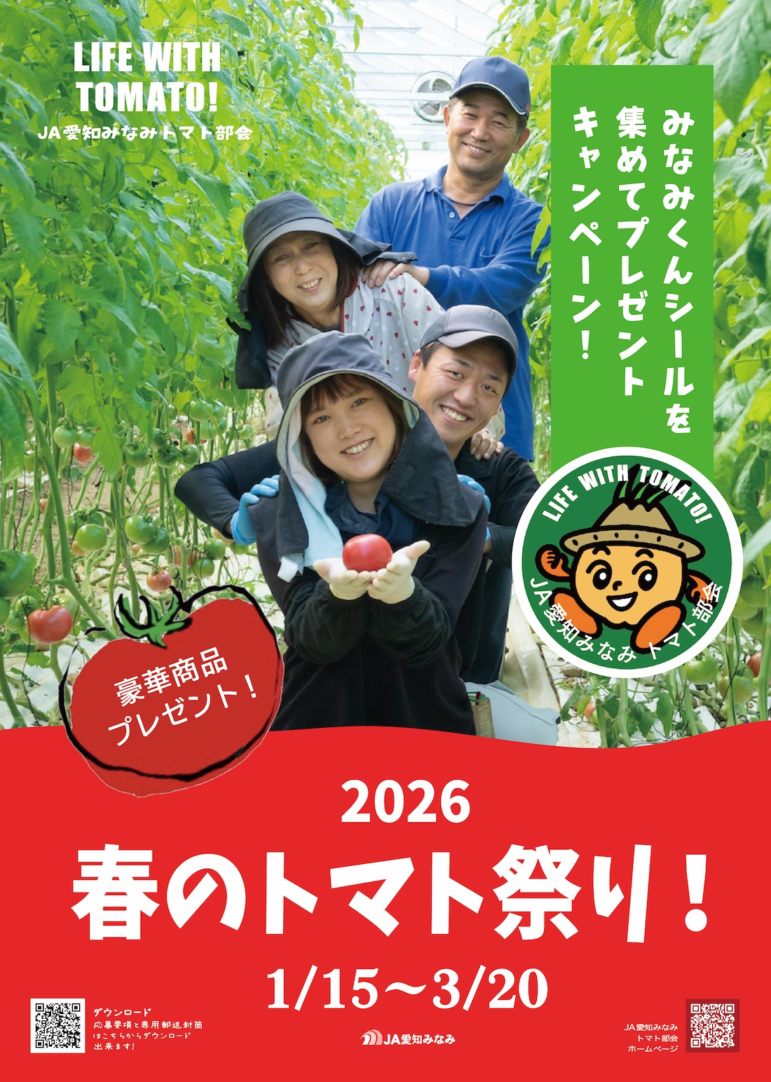 JA愛知みなみトマト部会では日頃の感謝とともに、私たちトマト部会が生産したトマトである証、店頭のトマトに貼られている「みなみくんシール」を皆さまにより親しんでもらいたいという思いを込めて、「2026 春のトマト祭り!」-みなみくんシールを集めてプレゼントキャンペーン!-を開催します。